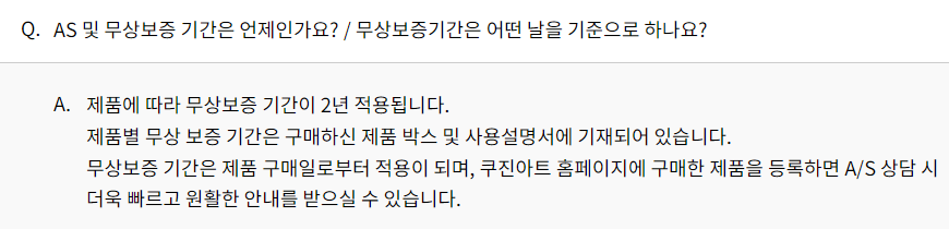 제품 구매일로부터 2년간 품질보증 기간이 제공됩니다. 구매 영수증이나 쿠진아트 홈페이지에 등록된 정보를 기준으로 확인합니다.- 구입 시기가 불분명한 경우 품질보증 서비스에 제한이 있을 수 있습니다.