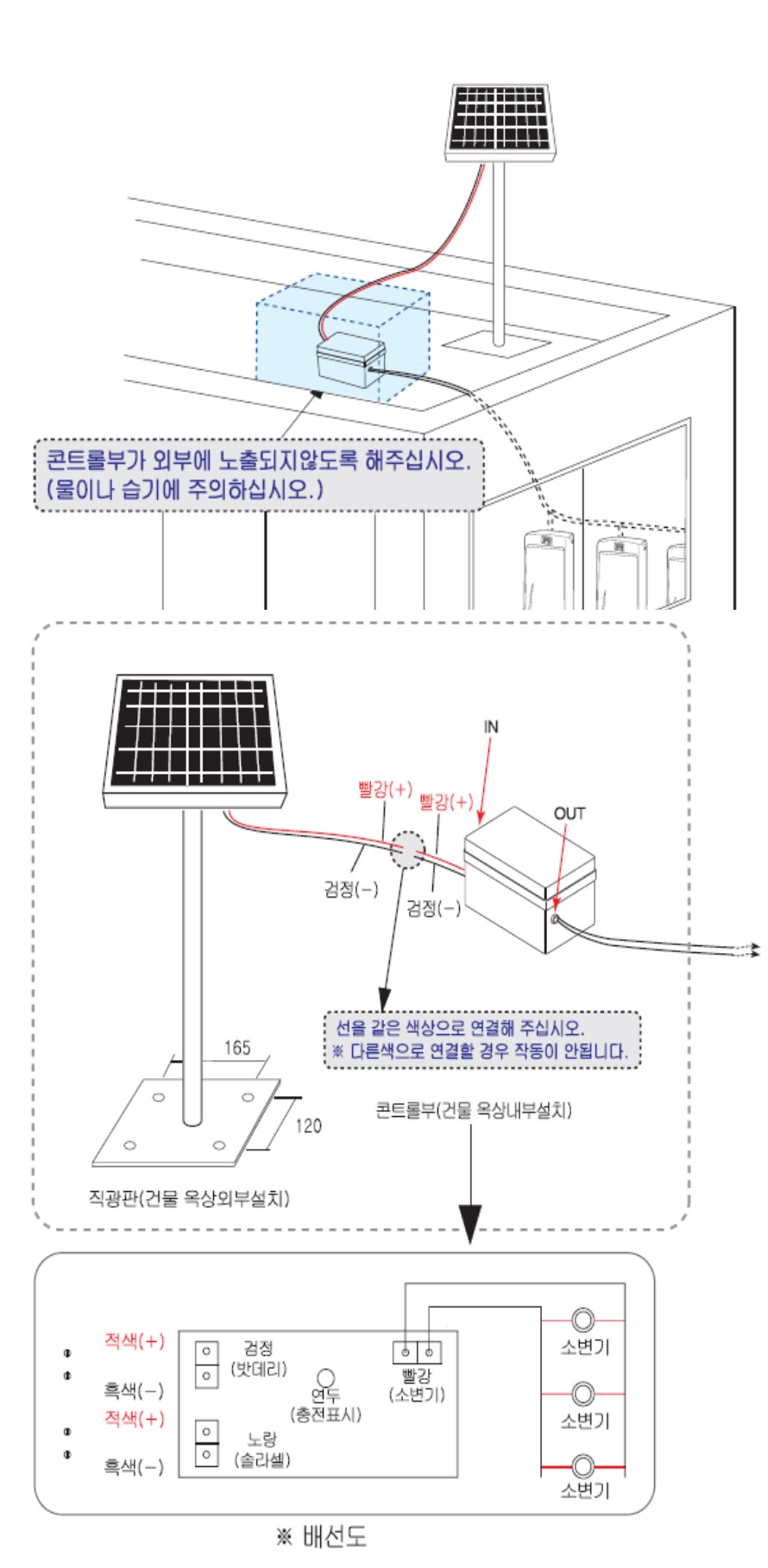 - 콘트롤러 단자에도 빨강(+)과 검정(-) 단자가 있으므로, 같은 색상끼리 정확히 연결해 주세요.